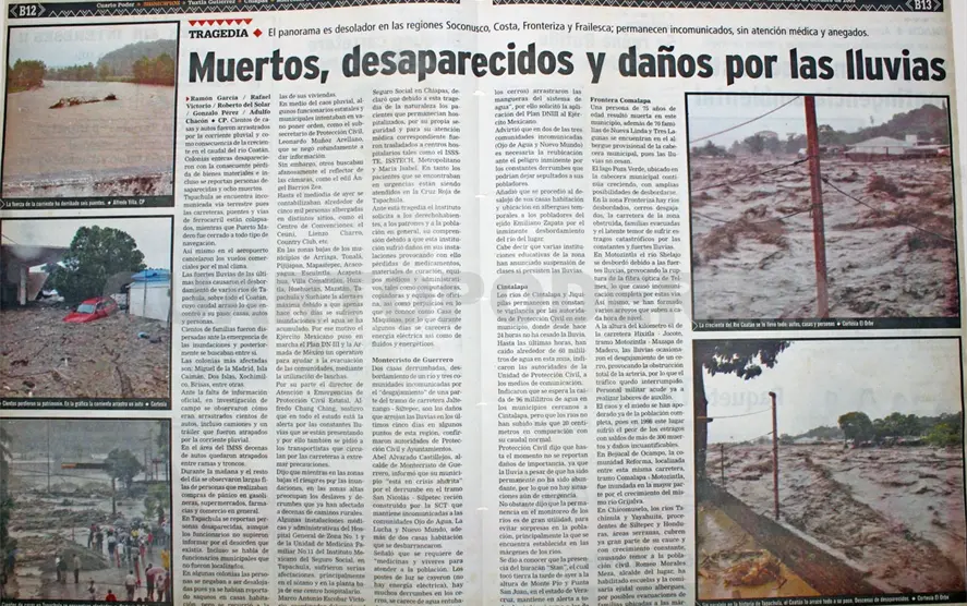 La geografía urbana de Tapachula cambió de un día para otro: decenas de colonias que se ubican en las márgenes de Coatán desaparecieron; el río destruyó cientos de casas que no soportaron las fuertes corrientes que también derribaron puentes y arrastraron vehículos y personas.