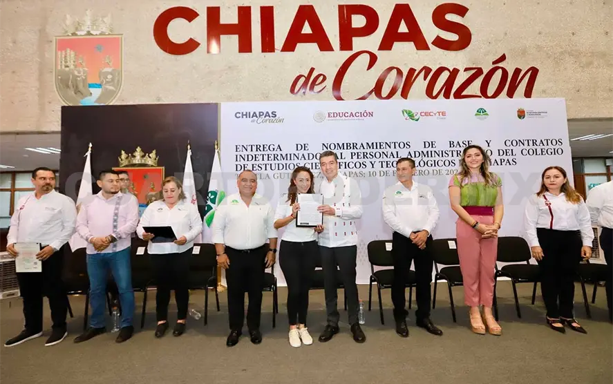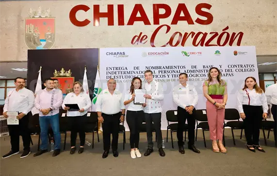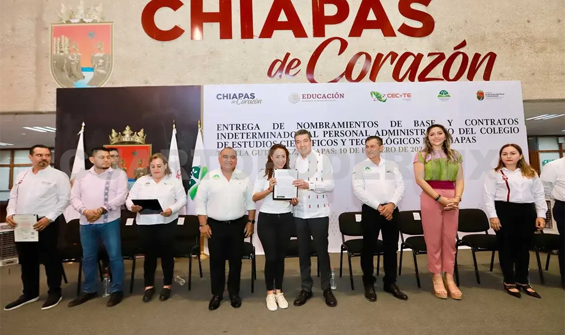 En la entrega de nombramientos de base y contratos indeterminados al personal docente y administrativo del Colegio de Estudios Científicos y Tecnológicos de Chiapas (Cecyte Chiapas), el gobernador Rutilio Escandón Cadenas destacó que además de justicia laboral, este acto constituye un reconocimiento por el desempeño profesional y el compromiso con la educación y preparación de la juventud chiapaneca.