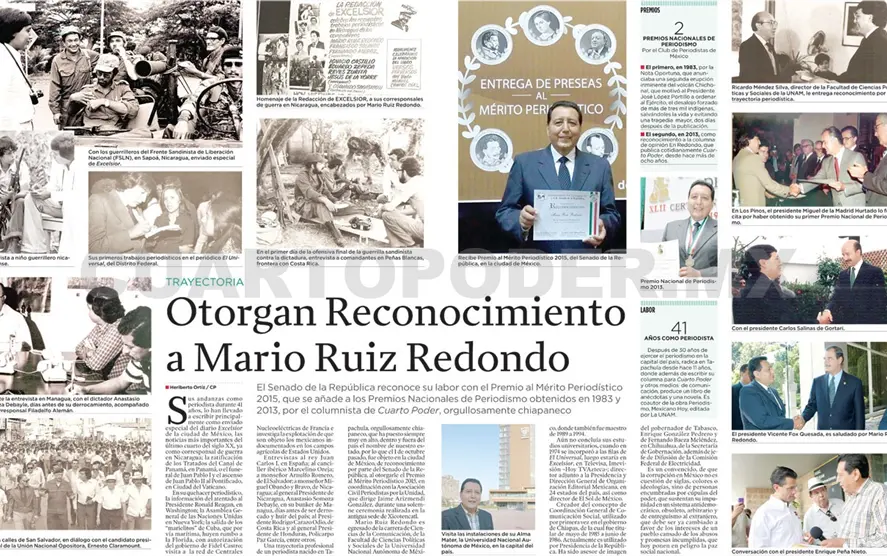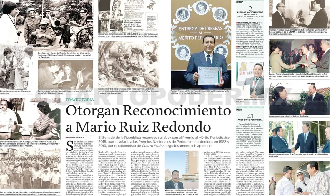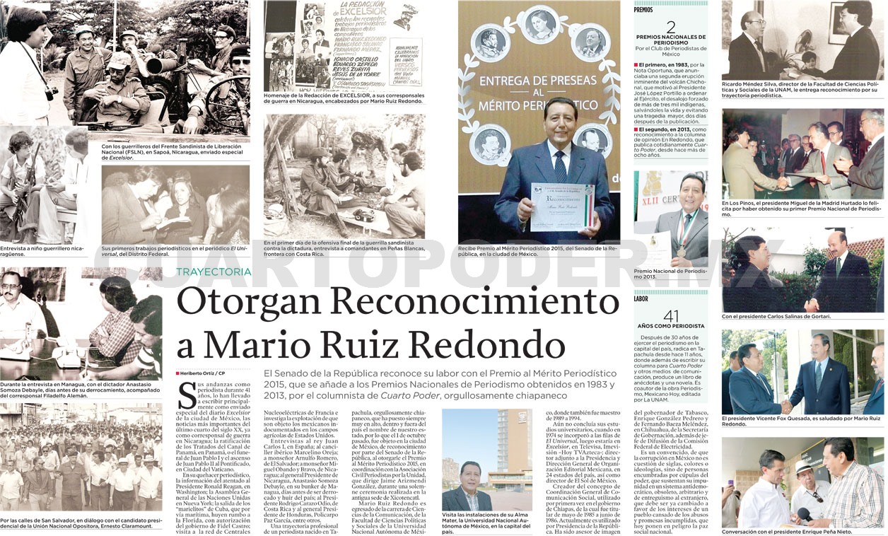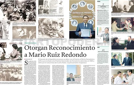 Una trayectoria profesional de un periodista nacido en Tapachula, orgullosamente chiapaneco, que ha puesto siempre muy en alto, dentro y fuera del país el nombre de nuestro estado, por lo que el 1 de octubre pasado, fue objeto en la ciudad de México, de reconocimiento por parte del Senado de la República, al otorgarle el Premio al Mérito Periodístico 2015, en coordinación con la Asociación Civil Periodistas por la Unidad, que dirige Jaime Arizmendi González, durante una solemne ceremonia realizada en la antigua sede de Xicotencatl.