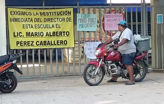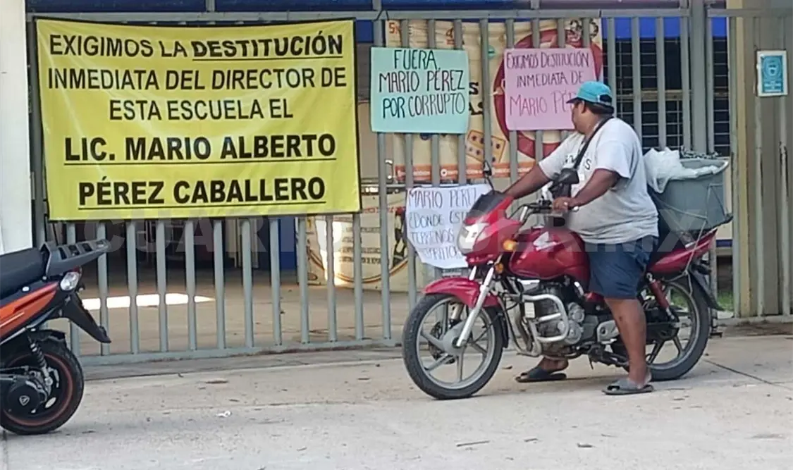 Día y noche llevan sin cesar las consignas para pedir la destitución inmediata de Mario Alberto Pérez Caballero, quien está señalado que en su administración de cuatro años ha logrado recaudar la cantidad de cinco millones de pesos de cuota de inscripción de los padres de familia.