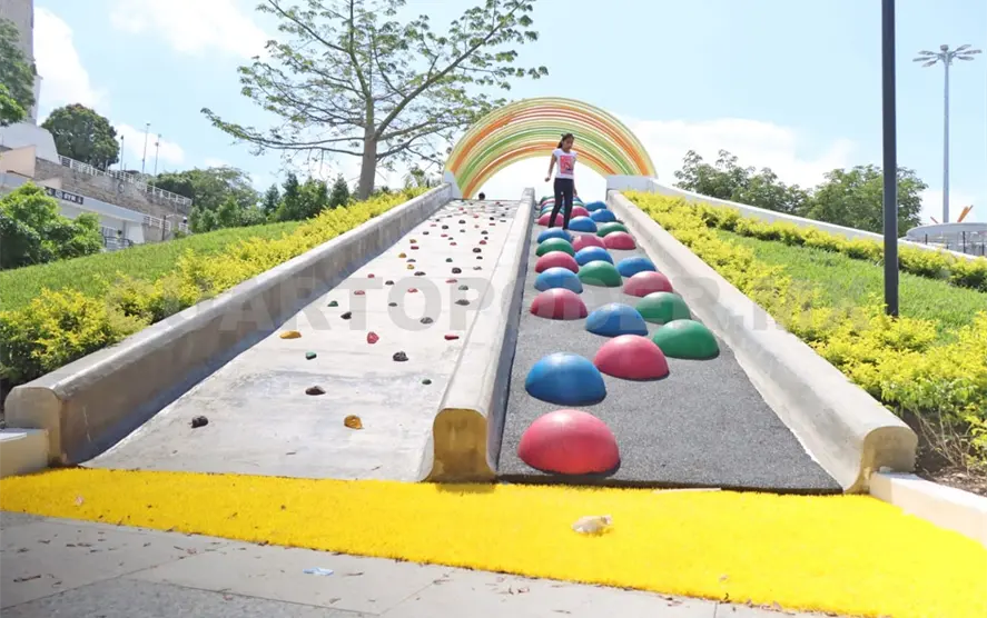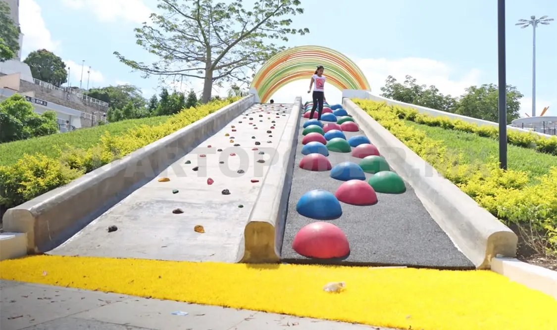 También hay varios puntos de reuniones con mesas al centro y con sillas que parecen columpios. Hay juegos que los niños y niñas pueden disfrutar, como las resbaladillas que cuentan con un arco en varios colores en la parte superior, los columpios en forma redonda en tonos blanco y negro.