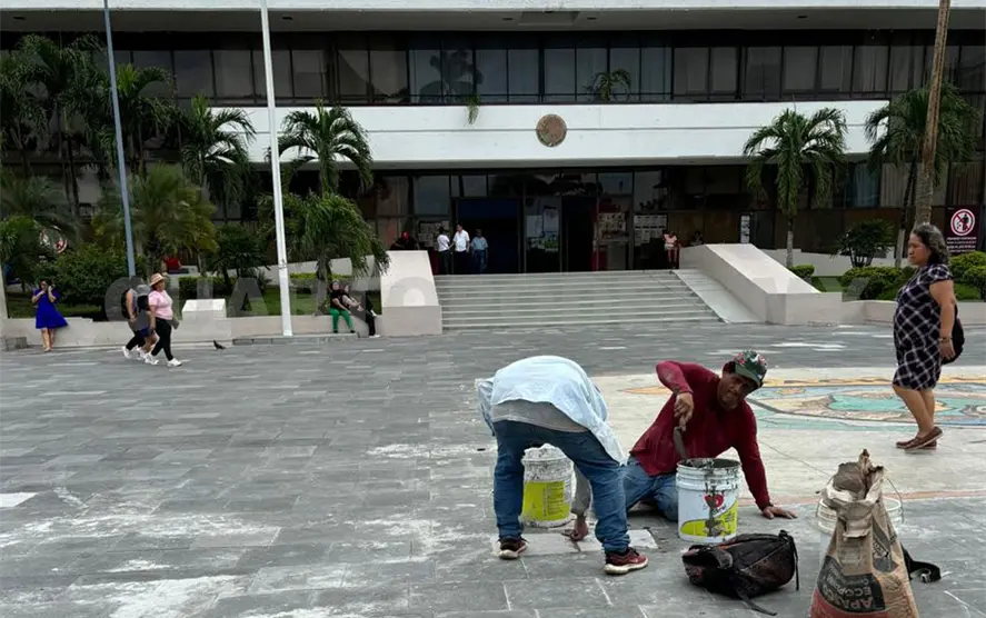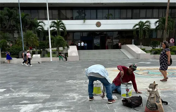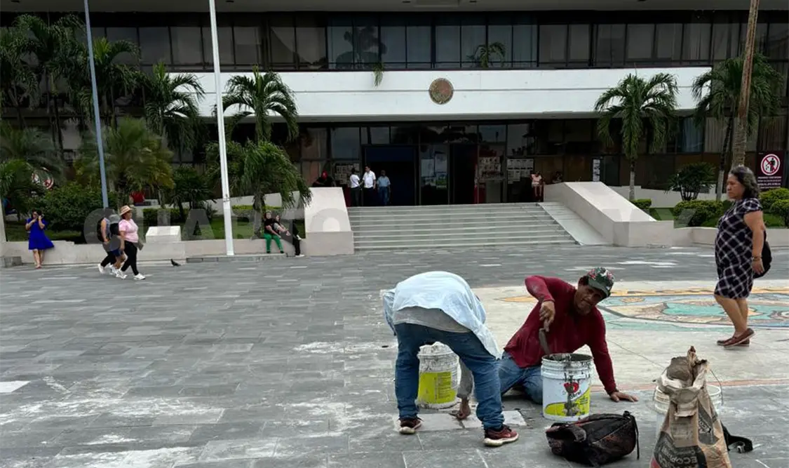 Grupos de albañiles se han dedicado a quitar las losetas que con las fuertes lluvias presentaban grietas, para cambiarlas por otras, pero con materiales que son diferentes al original.