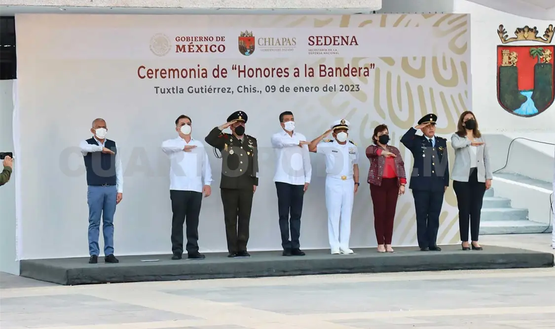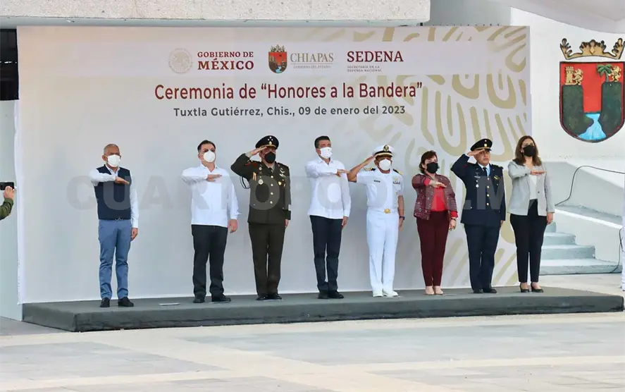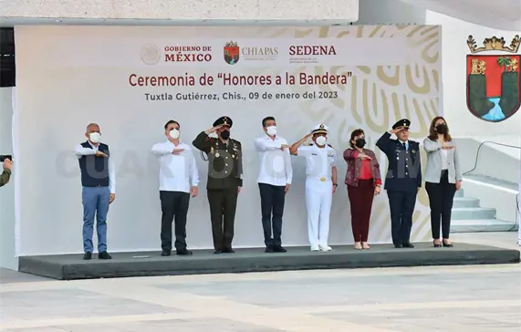 Luego de entonar el Himno Nacional Mexicano y el Himno a Chiapas, el gobernador junto con las y los servidores públicos, integrantes de la 31 Zona Militar, de los planteles educativos y de la sociedad civil, presenciaron el Izado a toda asta de la Bandera Nacional, al tiempo de dar a conocer las efemérides de este mes de enero.