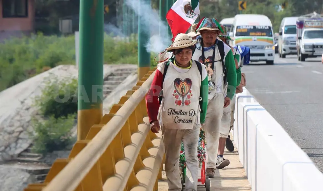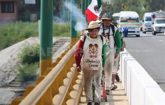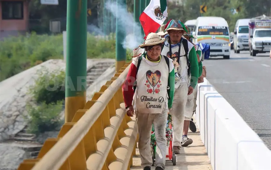 Cargan mochilas con artículos para descansar, una antorcha y la bandera de México con la imagen de la virgen de Guadalupe, mientras el asfalto caliente y el tránsito vehicular se vuelven parte del paisaje de su trayecto.