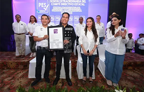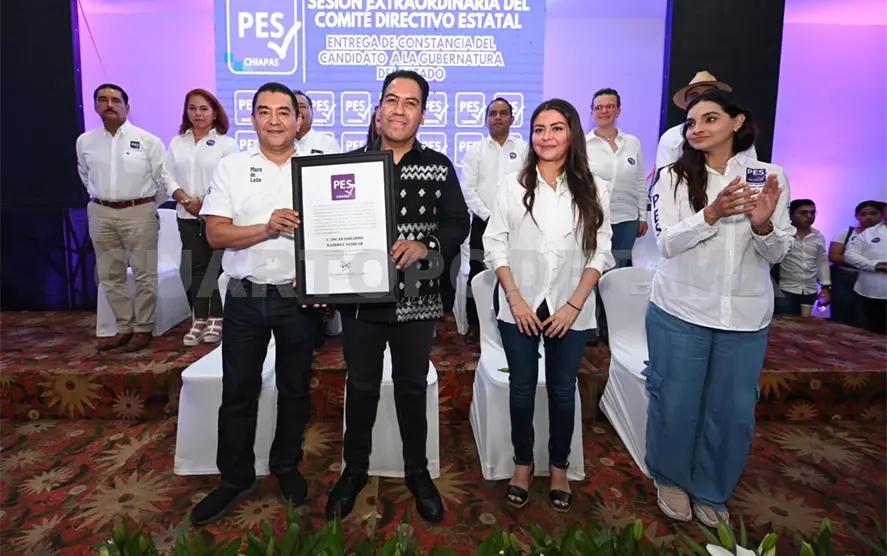 Durante la sesión del Comité Estatal del Partido Encuentro Solidario Chiapas (PES), el presidente del partido, Kalyanamaya de León Villard, entregó al senador con licencia, Eduardo Ramírez Aguilar, la constancia que lo acredita como candidato para el gobierno de Chiapas 2024 a 2030.