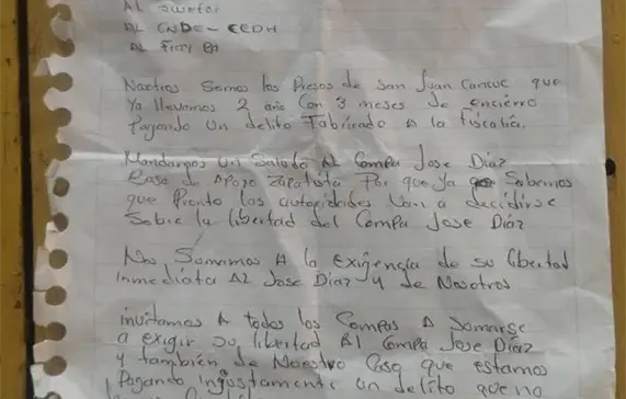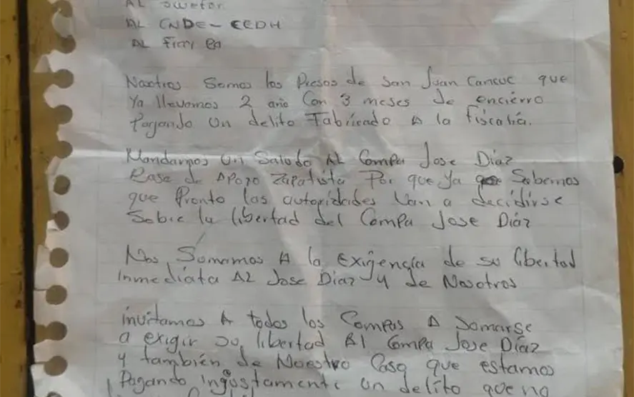 En un comunicado, Presos políticos de San Juan Cancuc exigieron la libertad de su compañero José Díaz, base de apoyo zapatista.