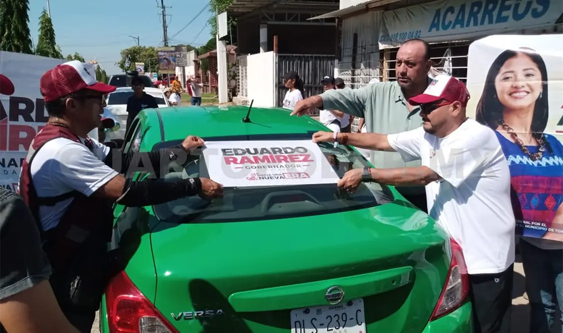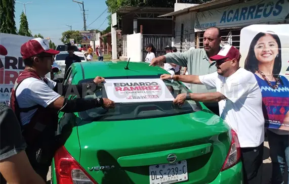 En el evento, los líderes de transporte local de Mapastepec, entre estos Roberto Sánchez Garza; del sitio Ricardo Flores Magón; Juan Guzmán Gallegos, sitio San Pedro; José Isabel Laguna Tovilla, sitio CGT; y Levi González de León, representante sitio 97, con sus agremiados colocaron calcas y microperforados en las unidades del servicio público de pasaje en pro del proyecto político de Eduardo Ramírez Aguilar y de Claudia Sheinbaum Pardo.