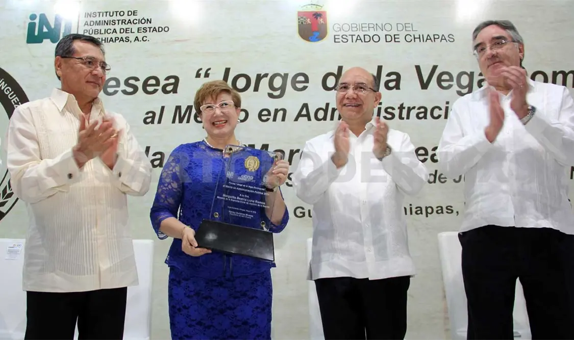 Este galardón, recordó Gómez Aranda, se estableció para reconocer la trayectoria política y de servicio público del fundador del IAP, don Jorge de la Vega Domínguez, quien fue Gobernador del Estado en 1977, año de creación de esta institución, y que hoy recibe con amplios méritos la Ministra Margarita Luna Ramos, una chiapaneca que pone en alto el nombre de Chiapas con su impecable labor al servicio de la Suprema Corte de Justicia de la Nación.