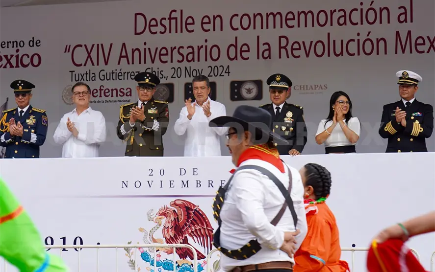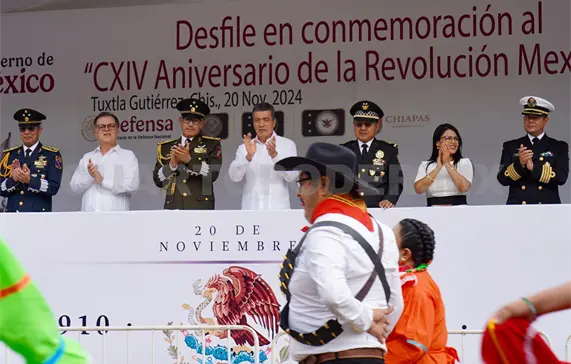 Junto a autoridades militares, representantes de los Poderes del Estado, así como cientos de familias que se dieron cita a lo largo de la avenida Central de Tuxtla Gutiérrez, el mandatario observó los carros alegóricos, las escoltas, bandas de guerra, tablas rítmicas y deportivas, así como representaciones de diferentes pasajes alusivos a este movimiento social de 1910.