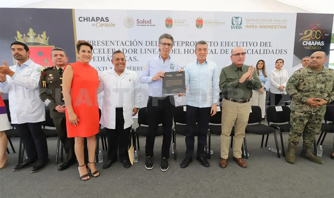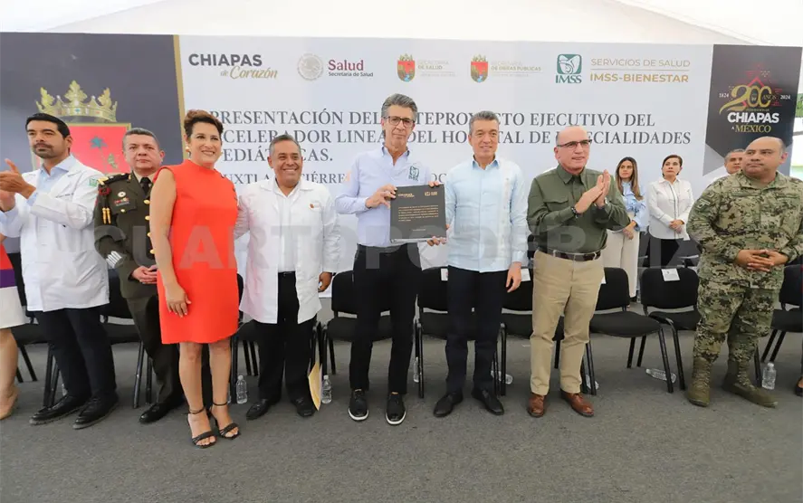En la presentación del Anteproyecto Ejecutivo del Acelerador Lineal del Hospital de Especialidades Pediátricas IMSS-Bienestar, de Tuxtla Gutiérrez, el gobernador Rutilio Escandón Cadenas anunció que en las próximas semanas se colocará la primera piedra que iniciará la construcción y el equipamiento integral de esta unidad de atención de enfermedades oncológicas, que contemplará una inversión conjunta de casi 500 millones de pesos (mdp).