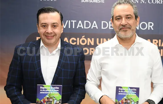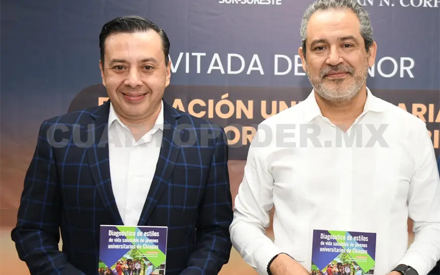 El rector de la Universidad Autónoma de Chiapas (Unach), Carlos Faustino Natarén Nandayapa y el coordinador de la Licenciatura en Desarrollo Humano de la Universidad de Ciencias y Artes de Chiapas (Unicach), Diego César Cantoral Cancino, presentaron el libro “Diagnósticos de estilos de vida saludables de jóvenes universitarios de Chiapas”.