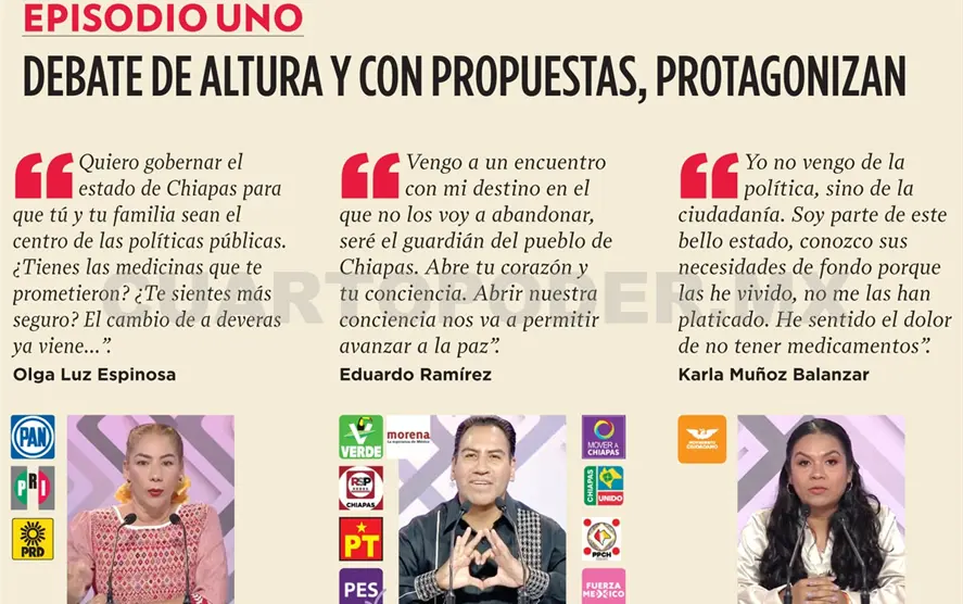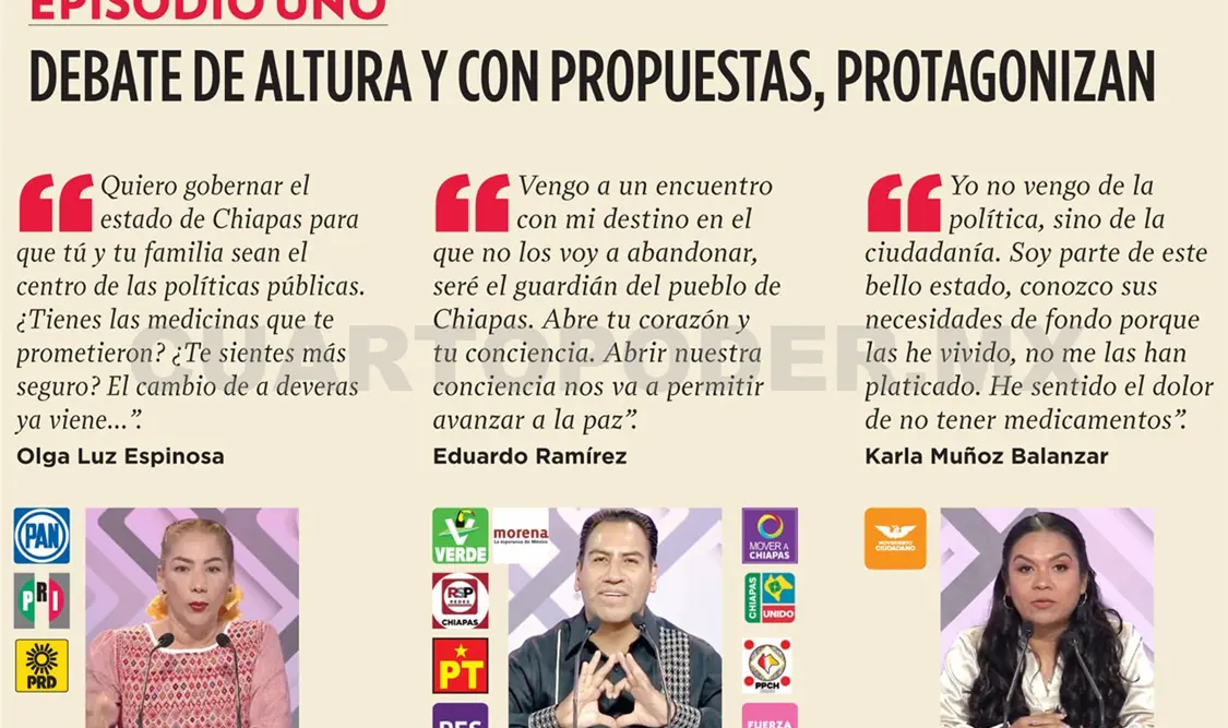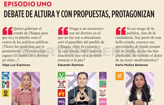 Hay que recordar que el próximo 2 de junio se renovarán mil 542 cargos de elección popular en Chiapas. Con este primer debate se puede tener una aproximación de las propuestas que dieron a conocer las candidaturas.