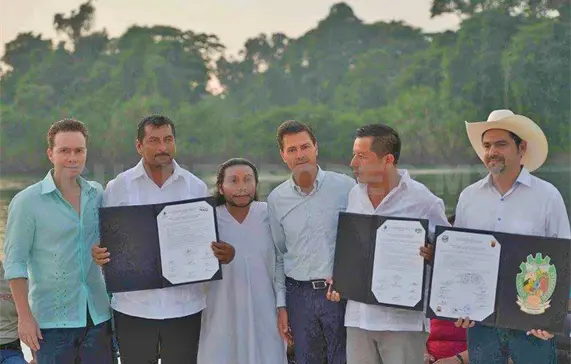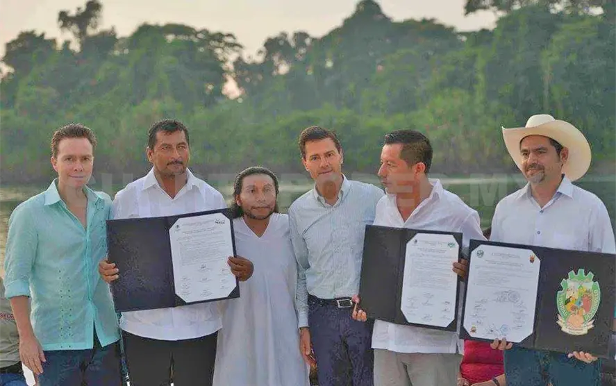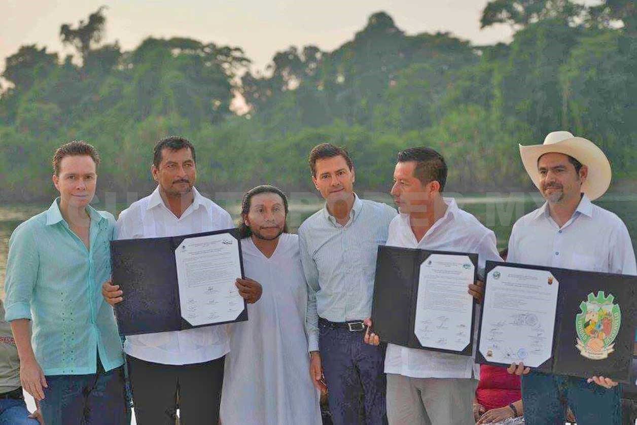 El presidente de la República, Enrique Peña Nieto, recibió de las manos del presidente municipal de Ocosingo, Héctor Albores Cruz, los acuerdos que buscan cuidar y preservar la zona natural denominada Montes Azules, los cuales fueron tomados por diversas comunidades e instituciones.