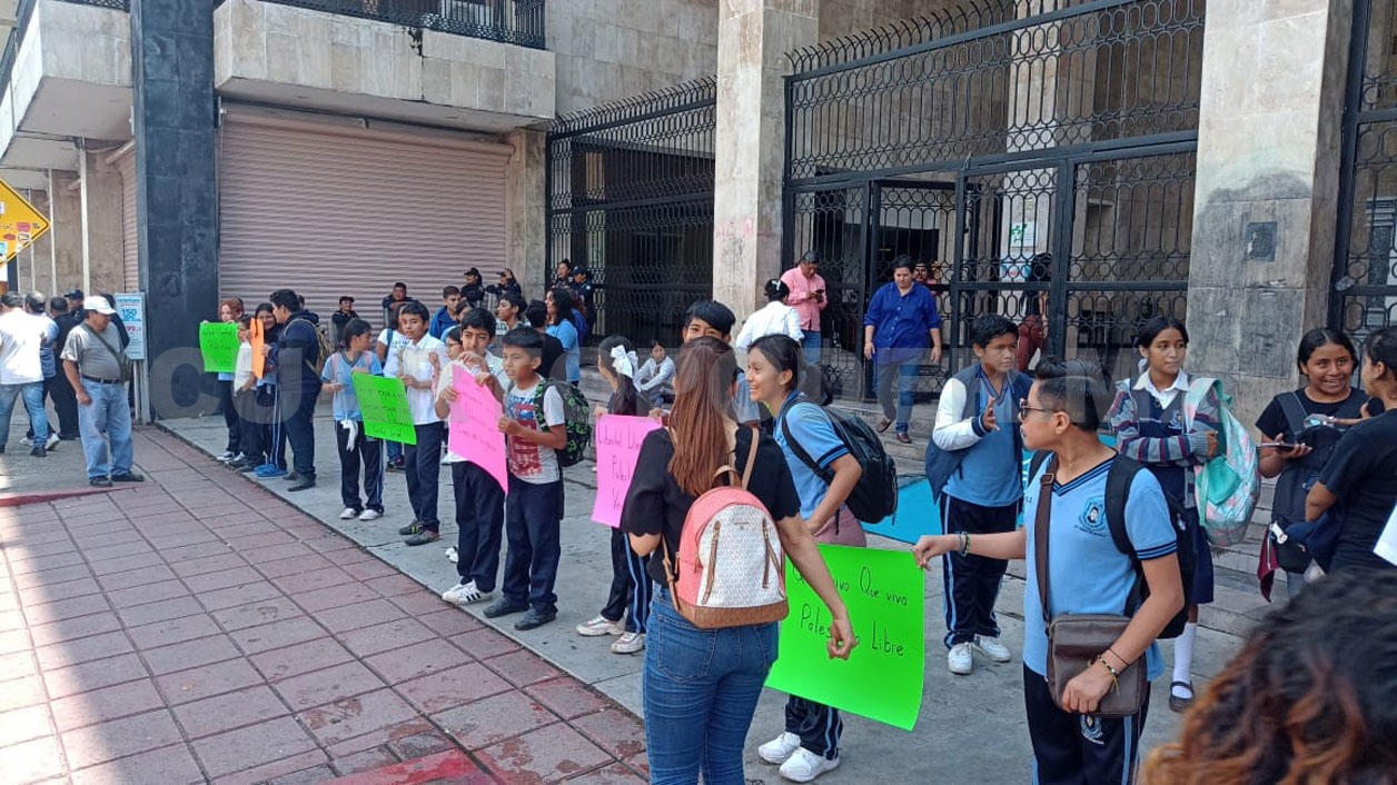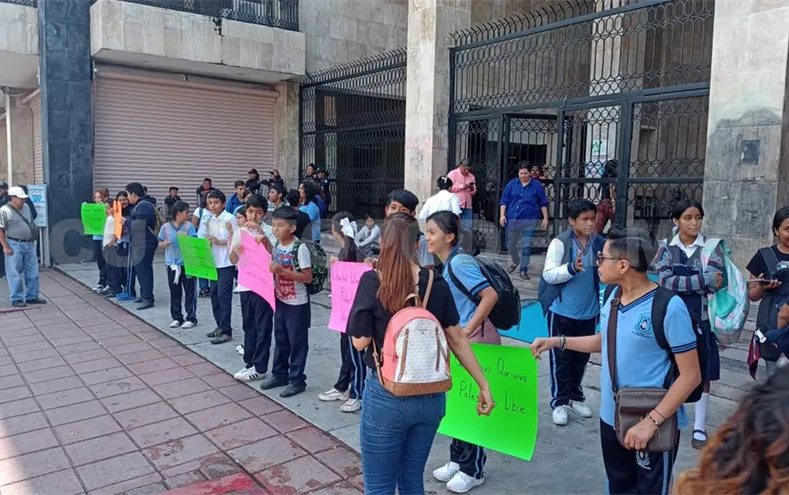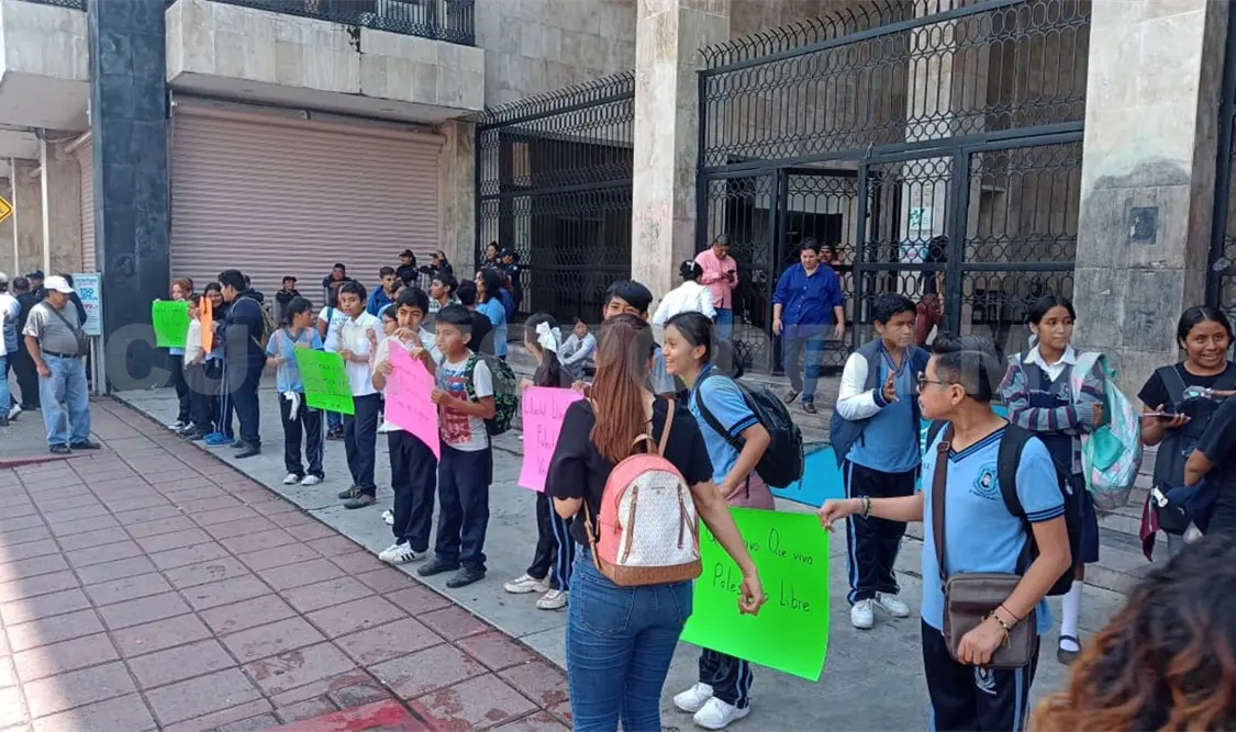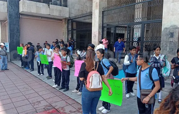 Los niños que se encontraban frente al Congreso del Estado, en horario escolar, vestían el uniforme y su mochila sobre la espalda, mientras sostenían pancartas con diversas consignas.