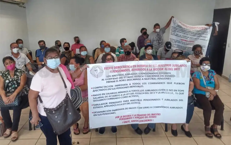 Dijo que a partir de 2019 han sufrido un atraco a los salarios de sus pensiones mensuales, debido a que les han quitado el tope salarial y les pagan con sueldos de activos, cuando son maestros jubilados y cuentan con el dictamen, sin embargo, no les pagan de acuerdo a la Ley del Isstech que es la que los rige.