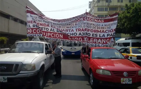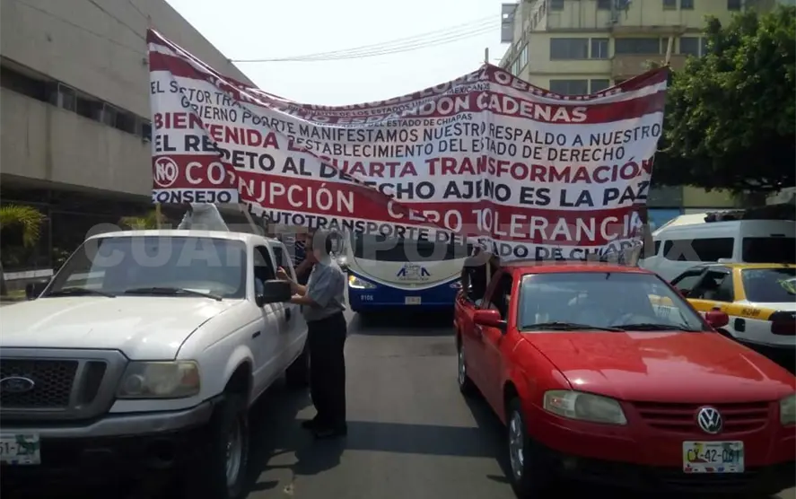Concesionarios y permisionarios del transporte público en sus diferentes modalidades de los municipios de la Costa, Sierra y Soconusco también realizaron este martes una manifestación para exigir la aplicación de la política anticorrupción en este gremio.