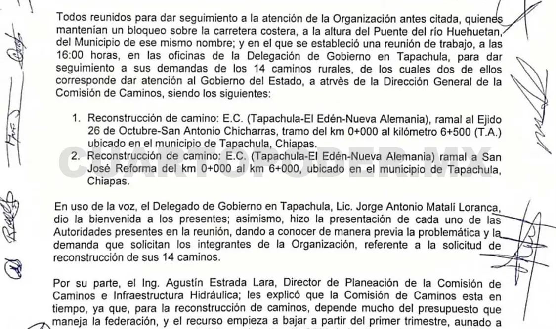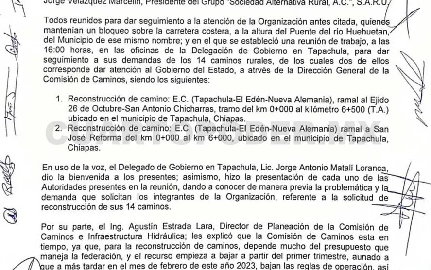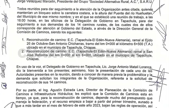 En la reunión participaron 50 personas del grupo Sociedad Alternativa Rural AC, y por parte de Gobierno del Estado se indicó y notificó en la minuta firmada sobre la petición de trabajos de reconstrucción en los caminos de Tapachula a El Edén-Nueva Alemania, ramal al ejido 26 de Octubre y San Antonio Chicharras, y la reconstrucción del camino ramal a San José Reforma, que estos dependen del presupuesto que maneja la Federación.