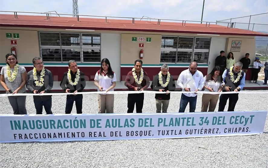 En el Colegio de Estudios Científicos y Tecnológicos del Estado de Chiapas (Cecyt) Plantel 34, ubicado en la colonia Real del Bosque, el mandatario inauguró aulas didácticas y obras exteriores, con una inversión de 4.8 millones de pesos, en beneficio de más de 700 alumnas y alumnos. Señaló que estos esfuerzos continuarán con nuevos proyectos de mejora en la infraestructura educativa de la capital.