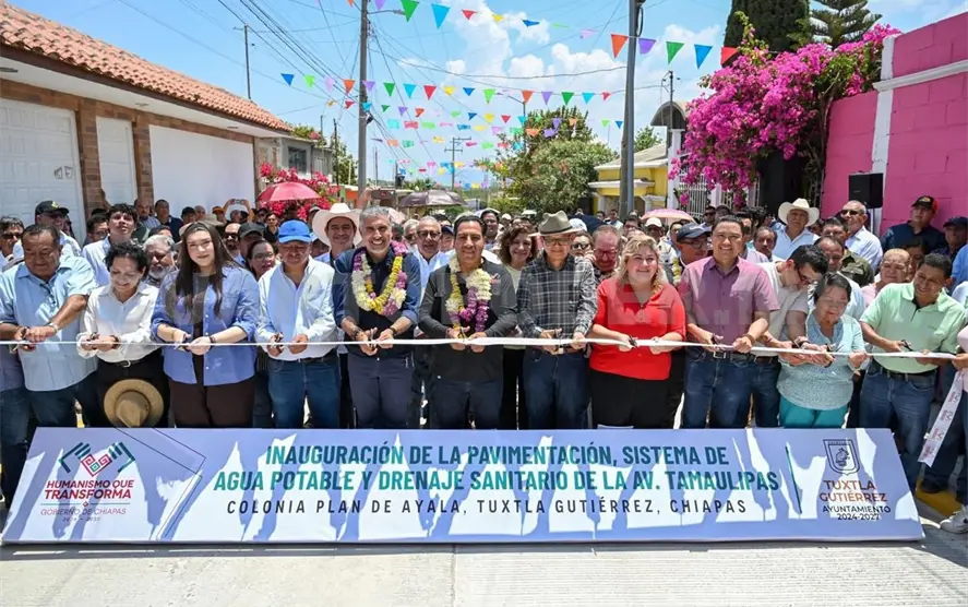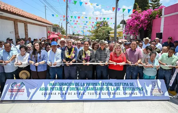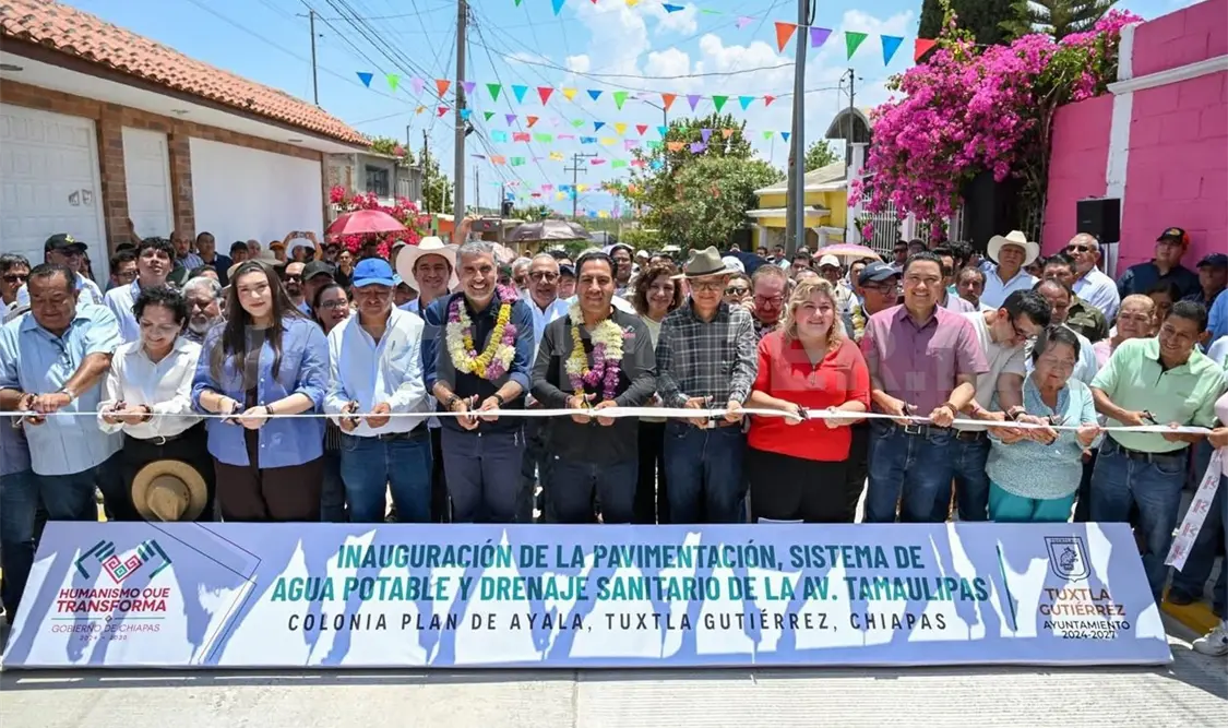 El gobernador Eduardo Ramírez Aguilar acompañó al alcalde de Tuxtla Gutiérrez, Ángel Torres Culebro, a la inauguración de la pavimentación y el mejoramiento integral del sistema de agua potable y drenaje sanitario de la avenida Tamaulipas, en la colonia Plan de Ayala, donde reafirmó el compromiso del gobierno de la Nueva ERA de trabajar en unidad para impulsar la prosperidad de la capital chiapaneca.