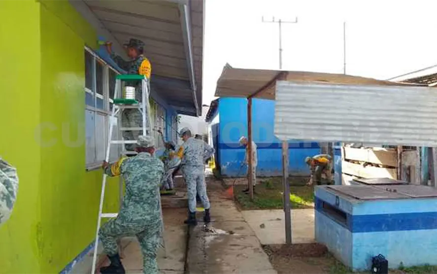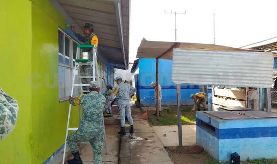 El personal castrense acudió al Colegio de Bachilleres de Chiapas (Cobach) plantel 258, ubicado en la colonia Nueva Morelia del municipio de Chicomuselo, para participar en la limpieza y aplicación de pintura en salones y canchas.