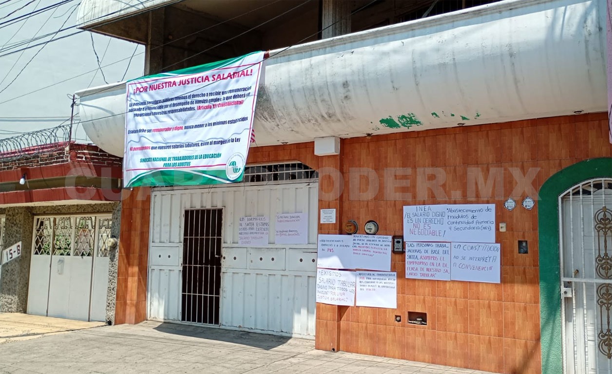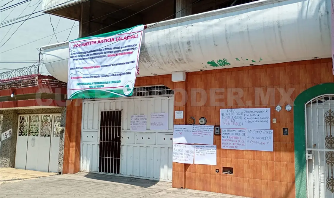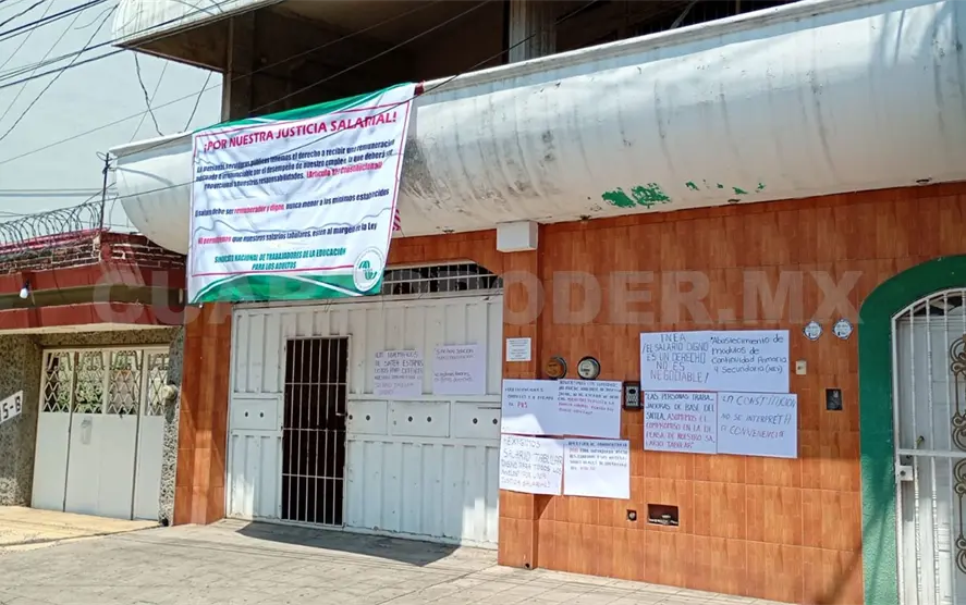 Pertenecientes al Sindicato Nacional de Trabajadores de la Educación para Adultos, instalaron una lona y cartulinas, en las oficinas delegacionales ubicadas en la 12ª. avenida Sur entre la Central y 2ª. calle Poniente, en la colonia Centro de Tapachula.