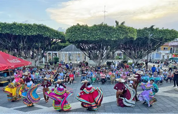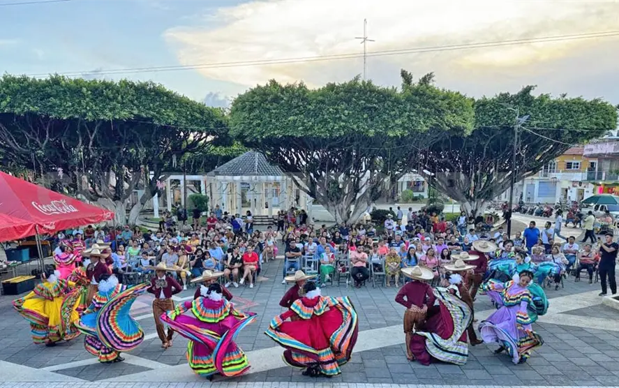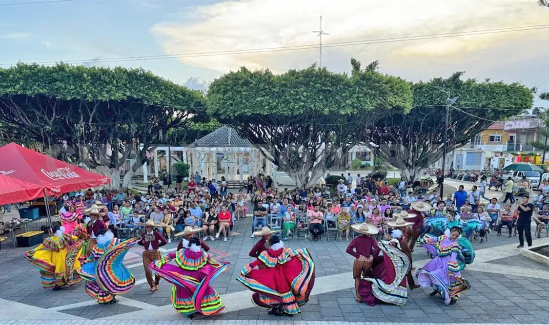 La compañía Xochiquetzal, famosa por su impecable ejecución y coloridos trajes tradicionales, trajo a Las Rosas la esencia de Puebla, mostrando su talento en una exhibición inolvidable, como parte de su gira en el sureste mexicano.