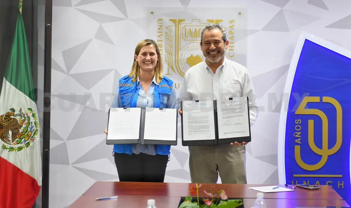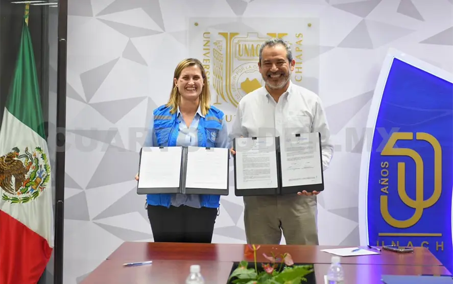 El rector de la Universidad Autónoma de Chiapas (Unach), Carlos Faustino Natarén Nandayapa, y la jefa de Oficina para el Área Sur de México de la Oficina del Alto Comisionado de las Naciones Unidas para los Refugiados (Acnur), Kristin Riis Halvorsen, firmaron una carta de entendimiento.