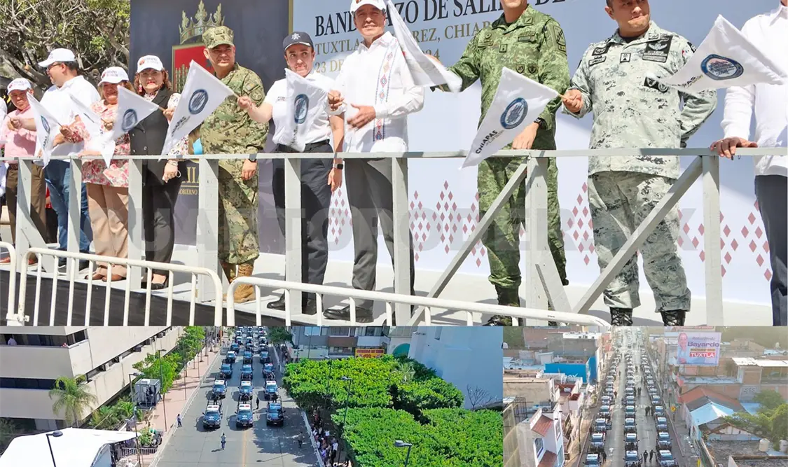 Desde la explanada de la Plaza Central, en el municipio de Tuxtla Gutiérrez, el gobernador Rutilio Escandón Cadenas dio el banderazo de salida de 213 nuevas patrullas que se desplegarán en diferentes municipios de Chiapas, como parte de las acciones para fortalecer la seguridad, de cara a los desafíos que se proyectan en la vida diaria, en cuanto a la protección a la vida, integridad y patrimonio de la población.
