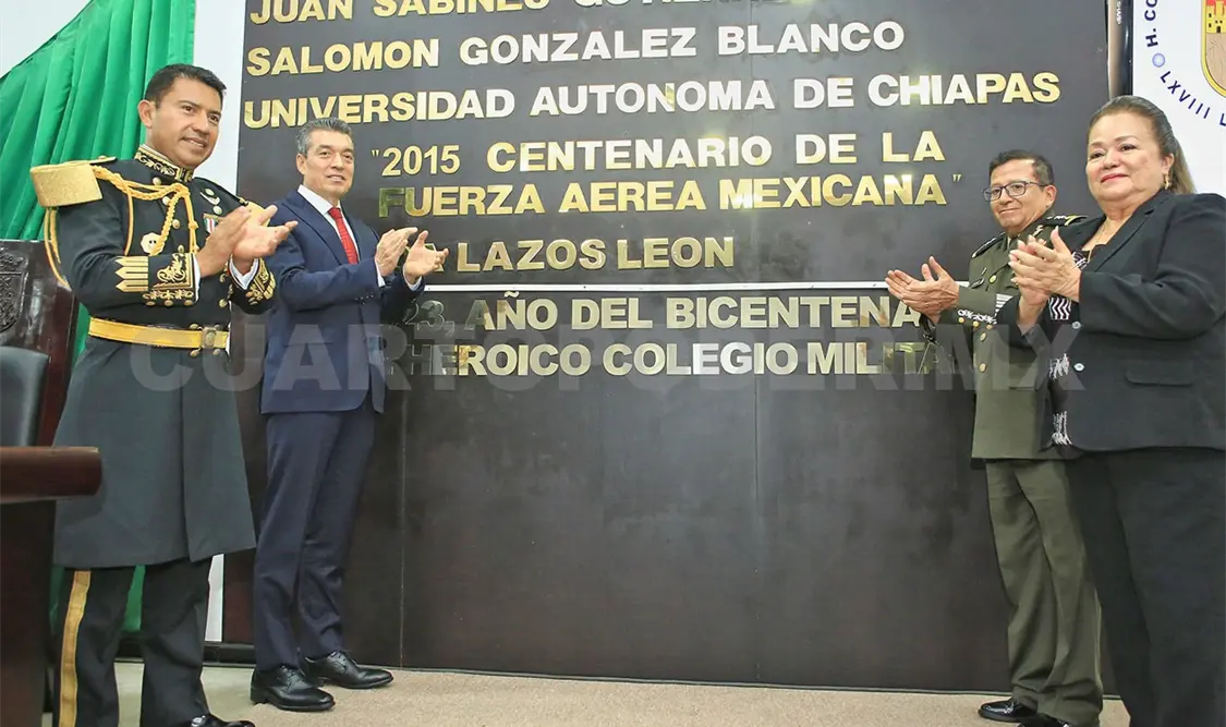 “En el marco de los festejos del bicentenario del heroico plantel, el alto mando del Ejército y Fuerza Aérea, así como las proezas realizadas a lo largo de la historia del Colegio Militar, la LXVIII Legislatura del Congreso del Estado de Chiapas reconoce su labor y autoriza inscribir con letras doradas en el muro de honor de este recinto, la leyenda: 2023, año del Bicentenario del Heroico Colegio Militar”, expresó.