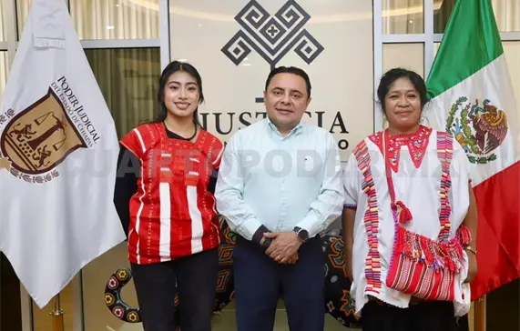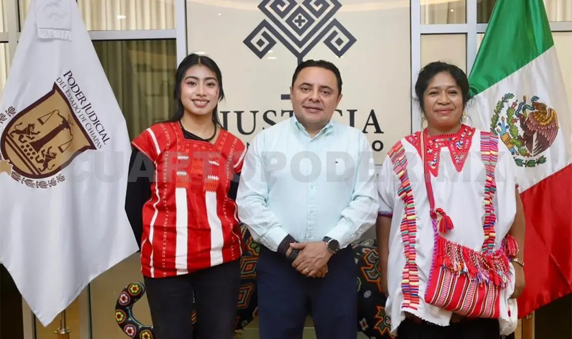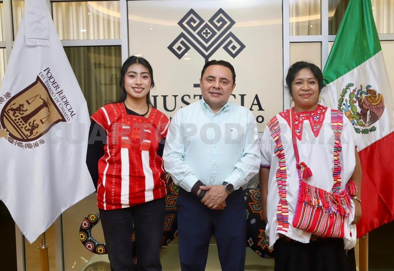 El magistrado presidente del Poder Judicial del Estado (PJE), Juan Carlos Moreno Guillén, sostuvo un encuentro con Patricia Gómez López y Zayra Itzel Méndez Gómez, integrantes del grupo de artesanas El Girasol, del municipio de Ocosingo, en las instalaciones de la sede judicial.