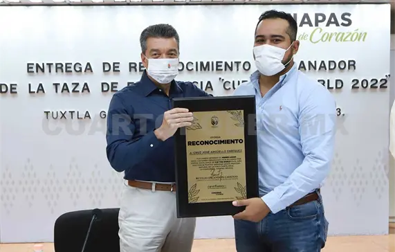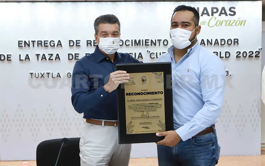 En la entrega de reconocimiento a Cruz José Argüello Enríquez, de la finca “Santa Cruz” del municipio de La Concordia, ganadora del primer lugar en “Cup the World 2022”, una cata especial realizada por la Alianza para la Excelencia del Café (Alliance for Coffee Excellence), creadora del certamen la “Taza de la Excelencia” (Cup of Excellence), el gobernador Rutilio Escandón Cadenas resaltó que este logro pone de manifiesto que Chiapas no solo es uno de los más grandes productores de café, sino que tiene el de mayor calidad en el mundo.