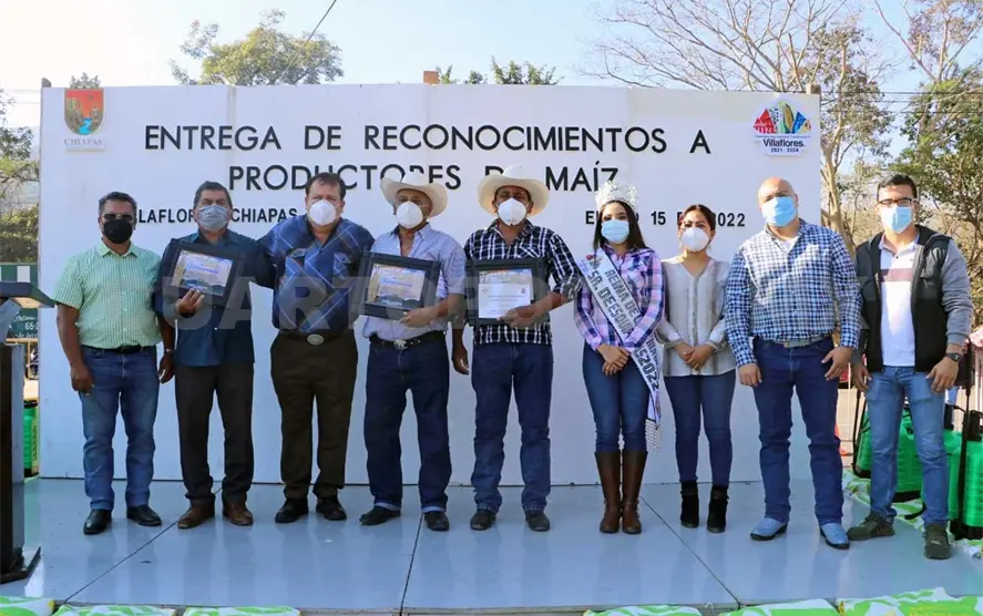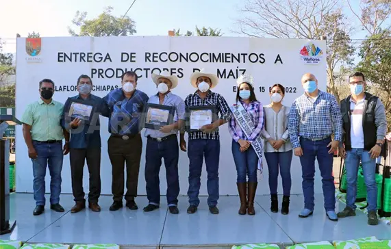 En el “Monumento a la Mazorca”, siguiendo las recomendaciones de la Secretaría de Salud y en el marco de la celebración de la Feria del Señor de Esquipulas Villaflores 2022, el alcalde Mariano Rosales Zuarth encabezó el reconocimiento a los productores de maíz que desde el año pasado y de acuerdo al decreto 139 de diciembre del 2020, se entregará a los campesinos con la mayor producción de maíz en el municipio.