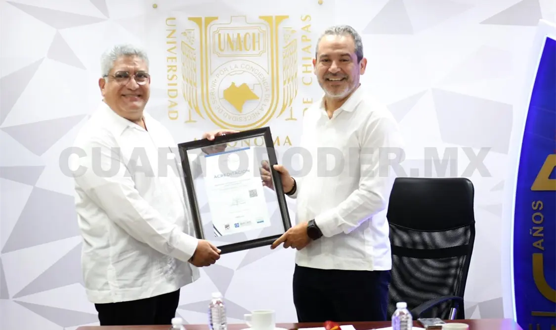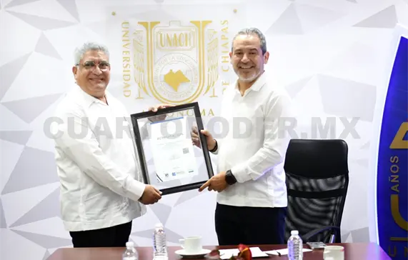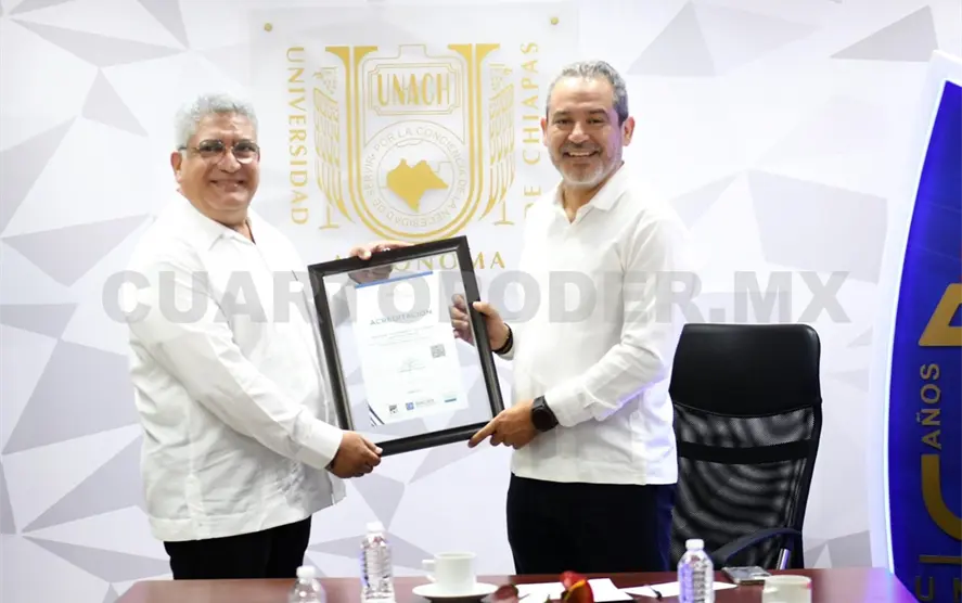 El rector Carlos Faustino Natarén Nandayapa entregó al director de la Facultad de Medicina Veterinaria y Zootecnia, campus II Tuxtla Gutiérrez, Hernán Orbelín Mandujano Camacho, el documento que refrenda la acreditación de su plan de estudios por los Comités Interinstitucionales para la Evaluación de la Educación Superior (Ciees).