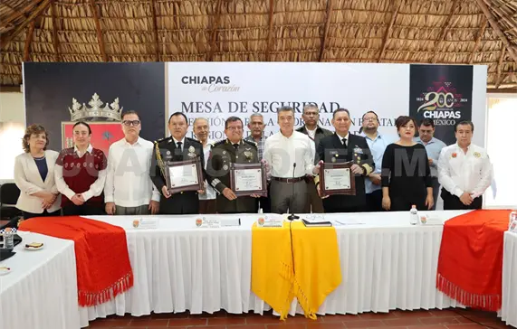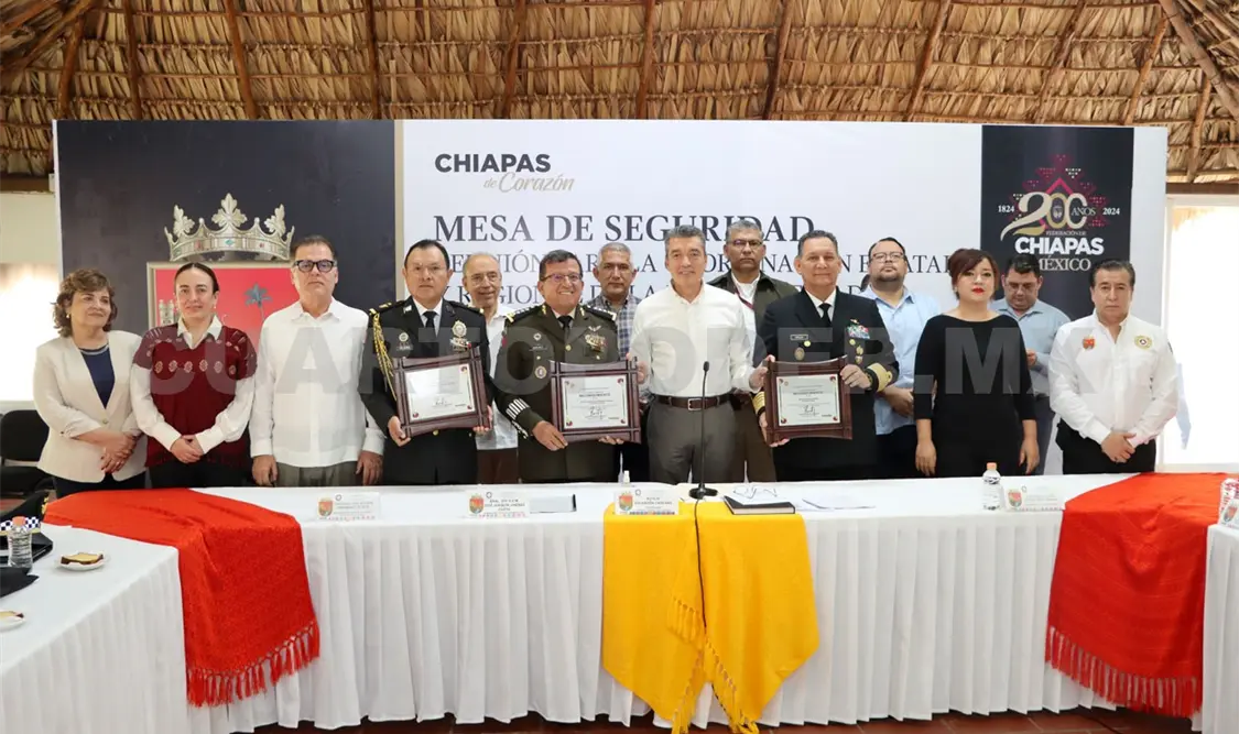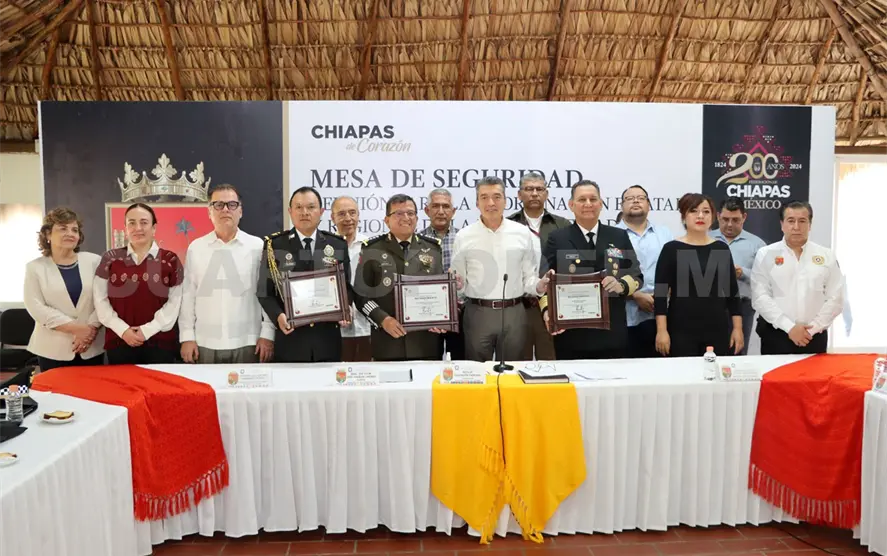 En el marco de la Mesa de Seguridad, el gobernador Rutilio Escandón Cadenas entregó reconocimientos al comandante de la VII Región Militar, José Joaquín Jiménez Cueto; al comandante de la 16ª Región Naval, Octavio Trejo Hermida, y al coordinador estatal de la Guardia Nacional (GN) en Chiapas, Antonio Hernández Tejeda, por su colaboración para la seguridad, estabilidad y bienestar del pueblo de Chiapas.