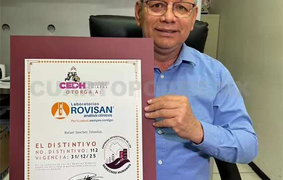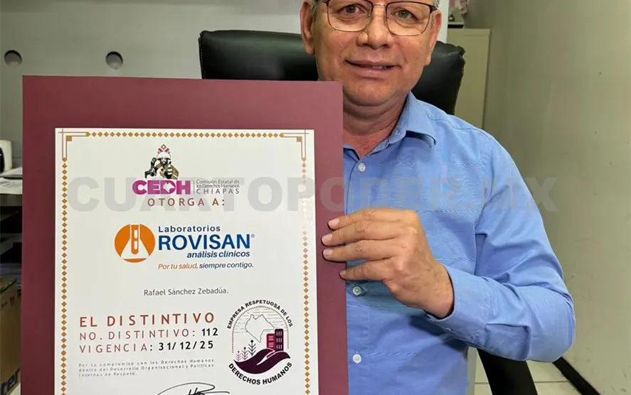 Por la implementación de políticas públicas enfocadas en ayudar al personal, el químico farmacéutico biólogo, Rafael Sánchez Zebadúa, recibió un distintivo como representante legal por tener empresas que respetan los derechos humanos de los colaboradores.