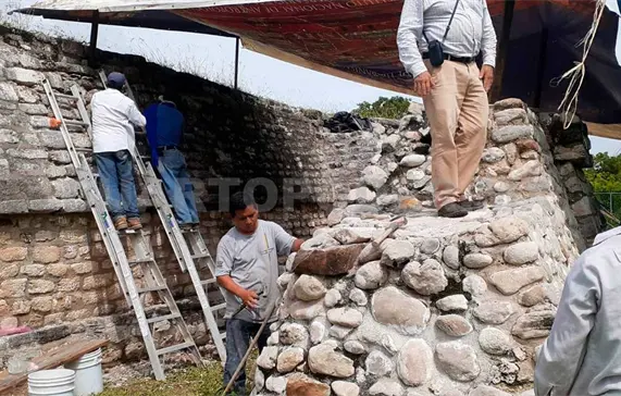 De este modo, comenta el titular del proyecto, Linares Villanueva, están atendiendo la zona de buzamiento, es decir, las partes que se inflaron y que se volvieron curvas, empujando los materiales provocando un desplome del 15 %, por ello se están utilizando materiales que reaccionen menos al agua, colocando sistemas de salida de agua y están sustituyendo el cemento, que anteriormente arqueólogos sustituían por los materiales naturales con los que estaban construidos y esto generaba fracturas en las piedras calizas y ahora se está remplazando por cal con el 95 % de pureza, con el fin de que haya un mejor juego en los materiales y pueda ser más permeable para que el agua pueda salir.