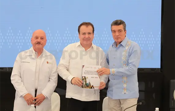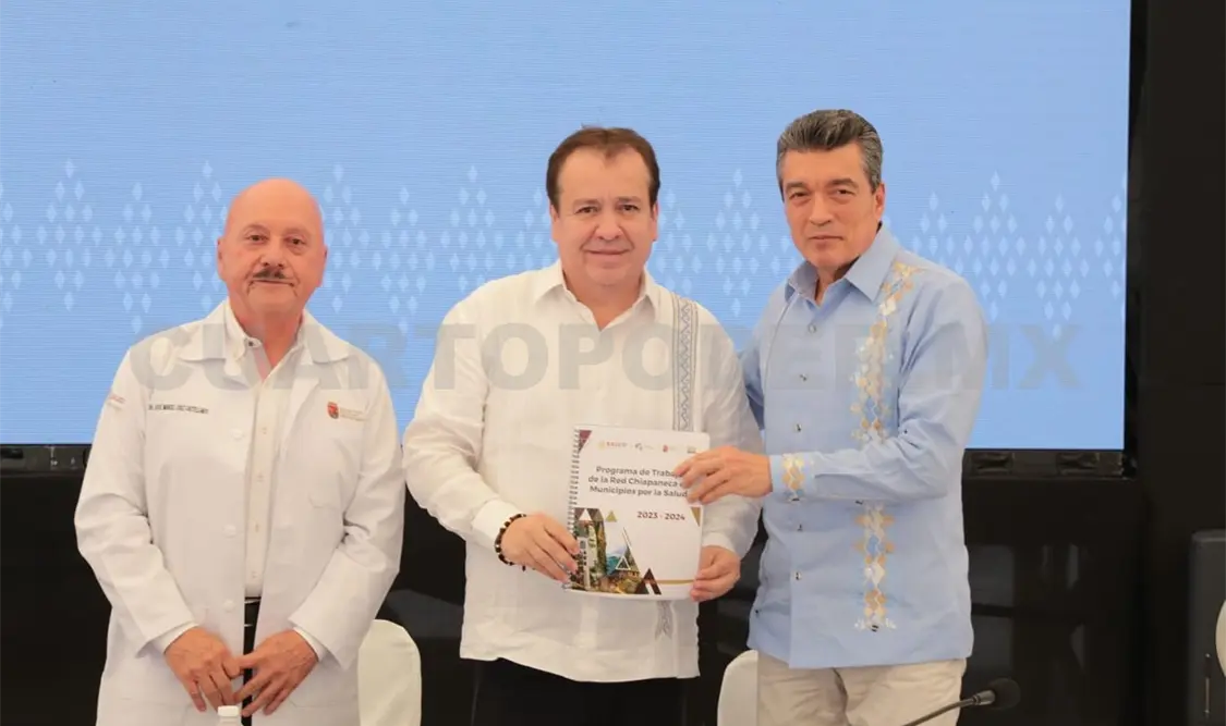 Este martes, el gobernador del estado, Rutilio Escandón Cadenas; el secretario de Salud, Pepe Cruz; y el presidente de la Red de Chiapaneca de Municipios por la Salud y alcalde de Villaflores, Mariano Rosales Zuarth, encabezaron la presentación del Programa de Trabajo 2023-2024 de la Red Chiapaneca de Municipios por la Salud.