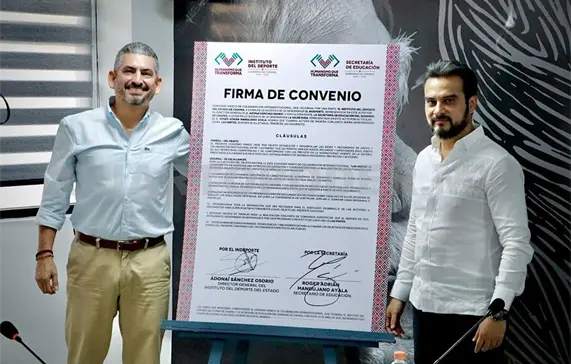La firma de este acuerdo, en el que también estuvo presente el director de Educación Básica, Hugo Campos Flores, tiene por objetivo contribuir al bienestar y desarrollo integral de las niñas, niños y jóvenes de educación básica, media y superior en el estado, así como de los jóvenes deportistas.