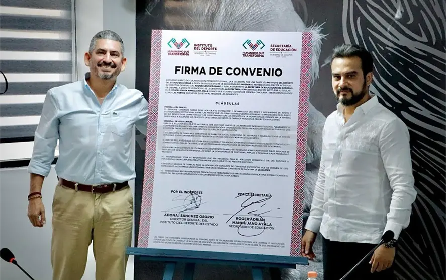 Bajo esa directriz, el secretario de Educación, Roger Mandujano Ayala y el director general del Instituto del Deporte del Estado de Chiapas (Indeporte), Adonaí Sánchez Osorio, concretaron este jueves un convenio de colaboración que tuvo lugar en las instalaciones de la dependencia educativa.