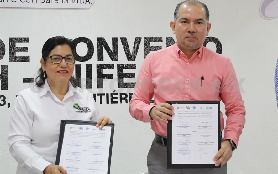 El director general del Instituto de la Infraestructura Física Educativa del Estado de Chiapas (Inifech), Enoc Gordillo Argüello, y la presidenta del Consejo Directivo del Colegio de Ingeniero Civiles de Chiapas (CICCH), María de Lourdes Moguel, suscribieron un convenio de colaboración para renovar los lazos que permitan elevar la competencia laboral y de productividad en beneficio de las y los trabajadores de la construcción, así como del personal del servicio público de ese instituto.