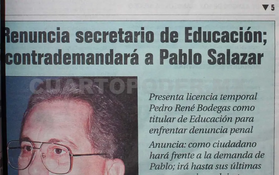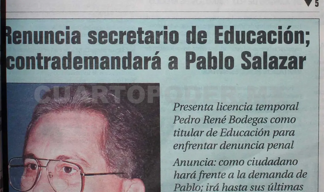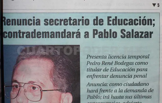 Derivado de la demanda interpuesta en su contra por Pablo Salazar Mendiguchia, candidato de la Alianza por Chiapas a la gubernatura, Pedro René Bodegas Valera renunció temporalmente ayer a la Secretaría de Educación (SE).