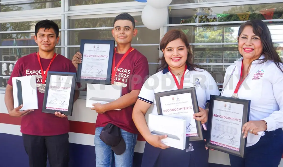 La directora general del Colegio de Bachilleres de Chiapas (Cobach), Viridiana Figueroa García junto al gobernador Eduardo Ramírez Aguilar reconocieron a Josué Antonio Aybar Zepeda, Ana Sarahí Aldana López y Enrique Morales Hernández, estudiantes del CEMSaD 255 Puerto Madero, por haber obtenido la acreditación internacional para representar a México en la ExpoCiencias Milset Brasil.