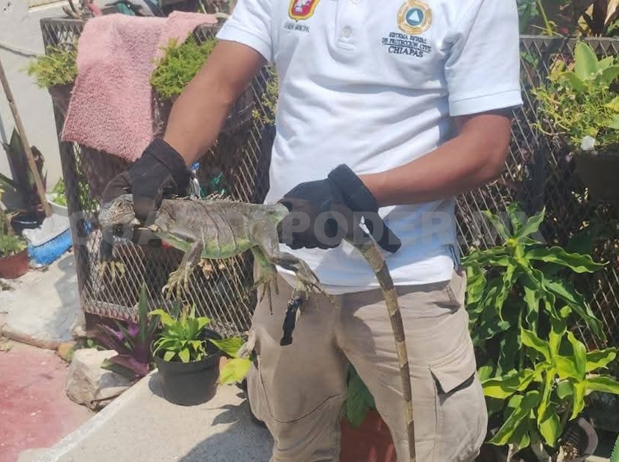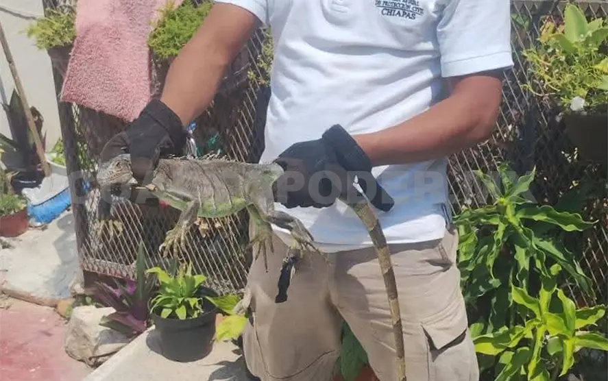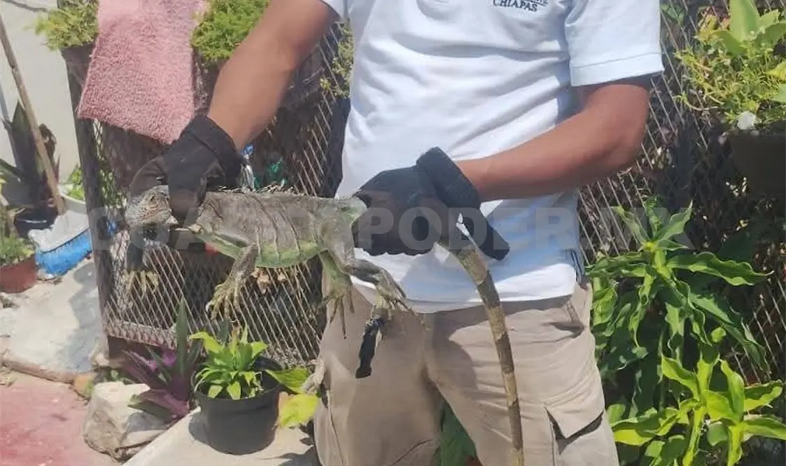 Elementos de Protección Civil Municipal atendieron el reporte ciudadano en el fraccionamiento Las Águilas en la capital chiapaneca, donde una iguana fue localizada al interior de un domicilio; el ejemplar fue entregado a la Procuraduría Federal de Protección al Ambiente (Profepa) para su resguardo y posterior liberación.