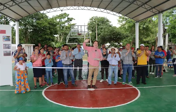 En la ranchería Miguel Hidalgo, del municipio de Villaflores, el alcalde Mariano Rosales Zuarth acompañado del presidente del Copladem, Guillermo López Gómez, residentes, niñas y niños, inauguró el nuevo espacio recreativo de la localidad.