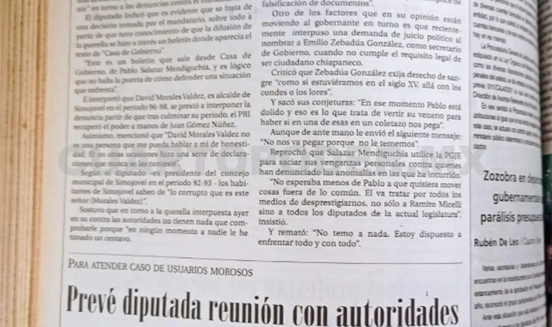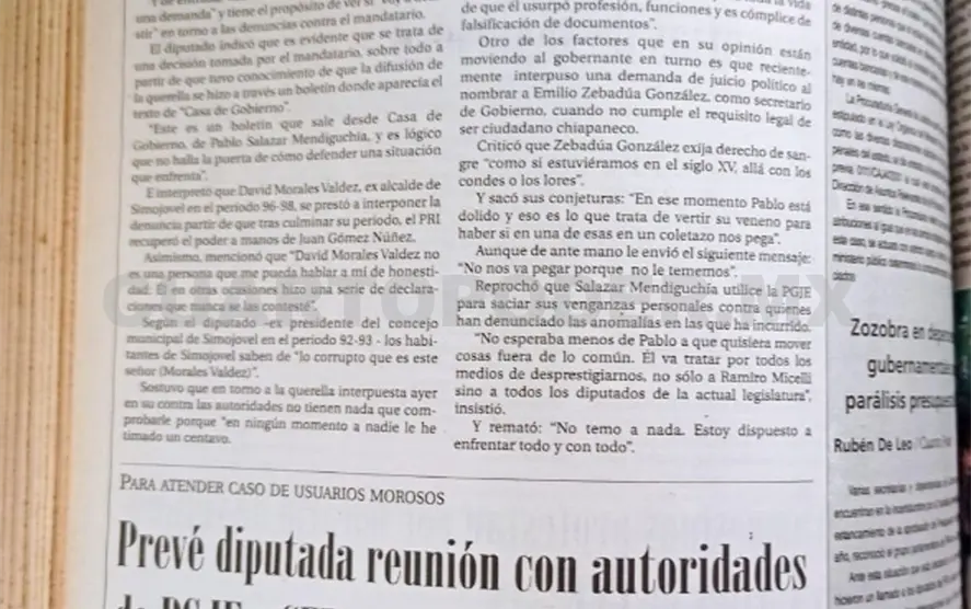 Las declaraciones del legislador se enmarcan luego de haberse enterado de que el ex presidente municipal de Simojovel, David Morales Valdez, interpuso ante la PGJE una demanda penal por el presunto delito de enriquecimiento ilícito en su contra y por el cual ya se inició la averiguación previa 0111/ CAJ4/2001.