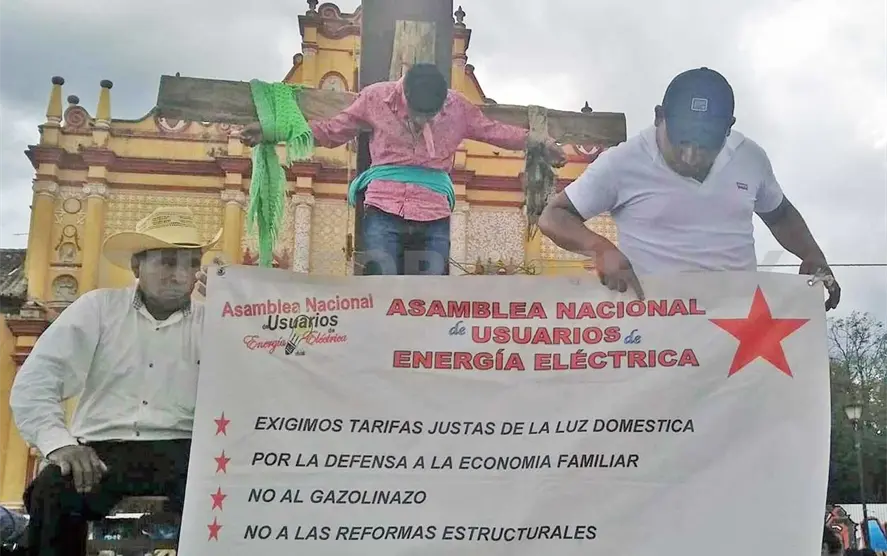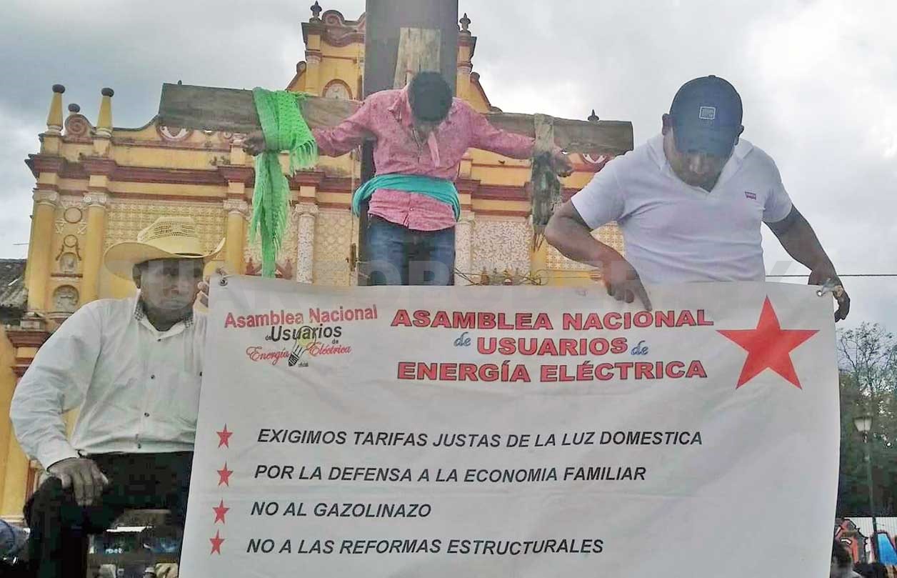 Dos hombres y una mujer integrantes de la Asociación Nacional de Usuarios de Energía Eléctrica (ANUEE) que se encuentran en plantón en el centro de esta ciudad, se crucificaron la mañana de este miércoles en la Cruz Atrial de la Plaza Catedral, para exigir el cumplimiento de sus demandas.