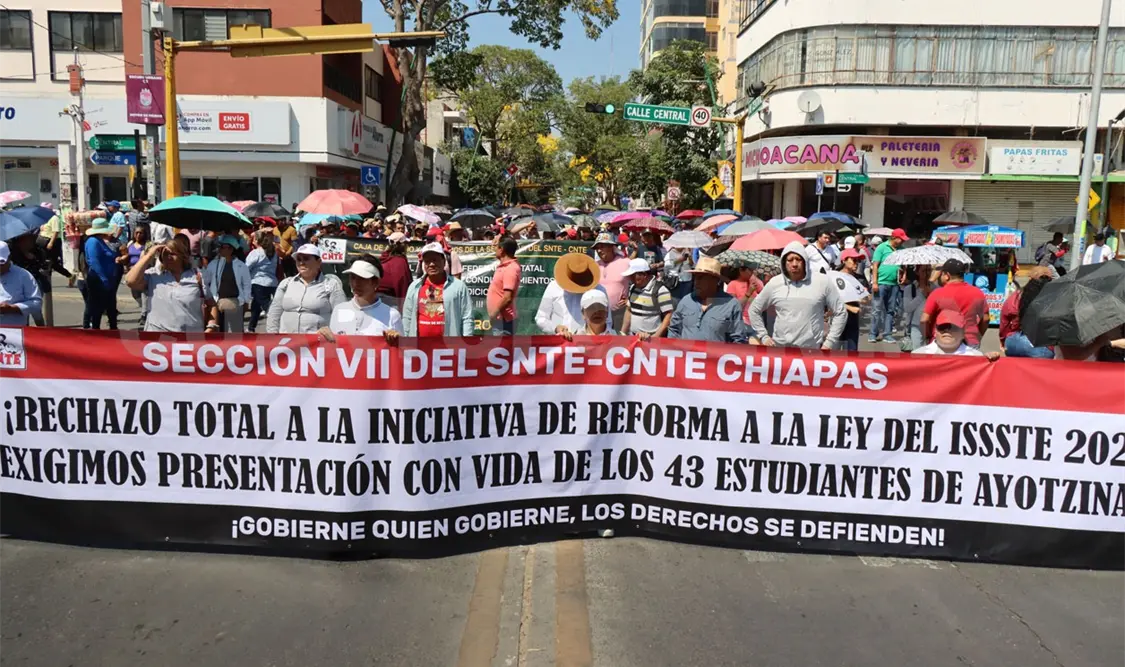 Maestros adheridos a la Sección VII del Sindicato Nacional de los Trabajadores de la Educación (CNTE-SNTE) marcharon este miércoles en Tuxtla Gutiérrez y otros municipios de la entidad, en el marco de la acción global por Ayotzinapa, asimismo aprovecharon para manifestar su rechazo a la reforma a la Ley del Issste.