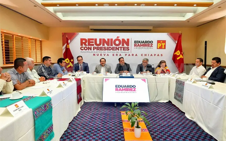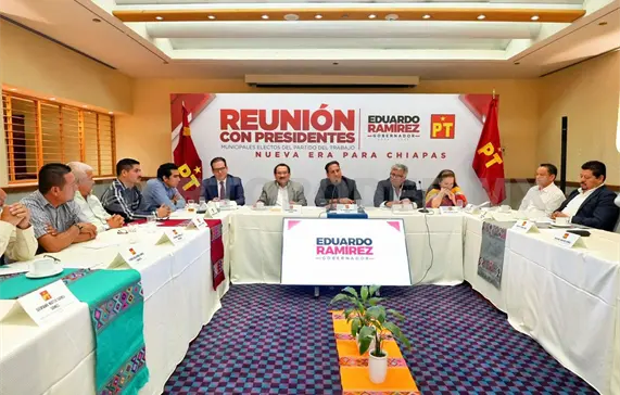 Con la finalidad de coordinar esfuerzos que beneficien a cada municipio, el gobernador electo de Chiapas, Eduardo Ramírez Aguilar, sostuvo un encuentro de trabajo con presidentes municipales electos del Partido del Trabajo (PT).
