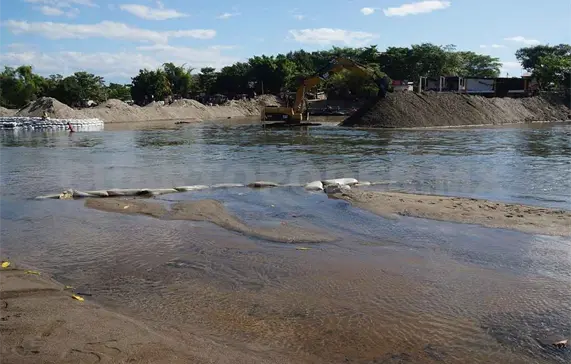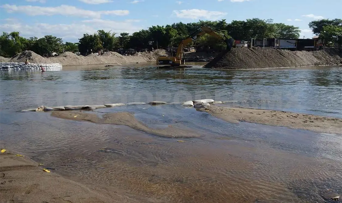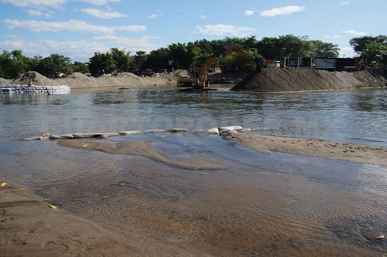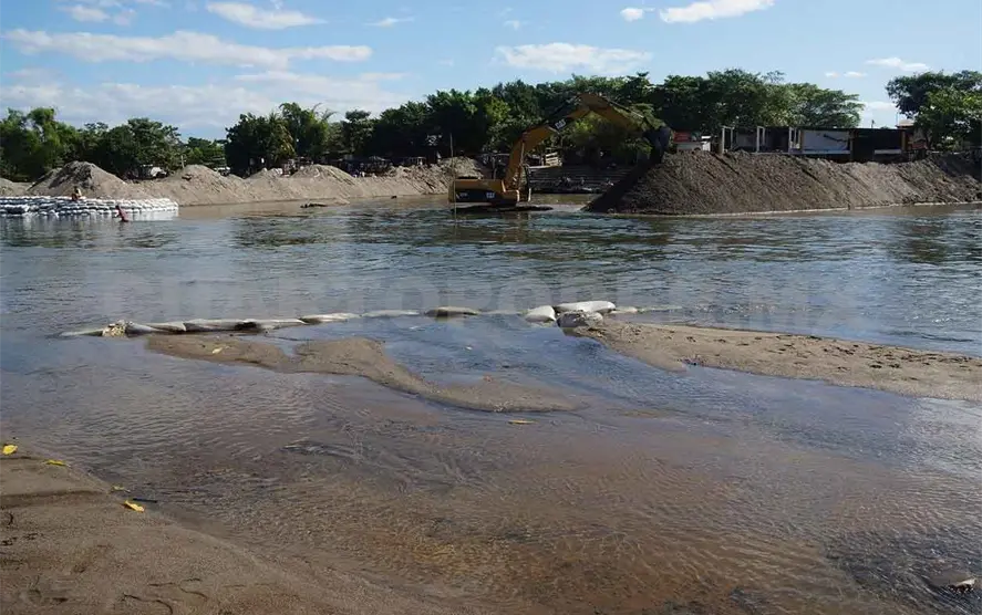 Maquinaria pesada trabaja sobre el afluente, del lado guatemalteco, en sacar arena y seguir haciendo canales para que por estos crucen las balsas cargadas de mercancías e incluso personas por si no quieren mojarse los pies.