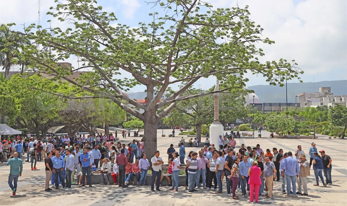 Este 19 de septiembre aún resaltaba el verde, blanco y rojo en palacio de gobierno, pues estamos en la celebración del mes patrio. Los más preventivos en la capital se desplazan sobre la plancha de concreto cubriéndose el rostro con algunas gorras y sombrillas.